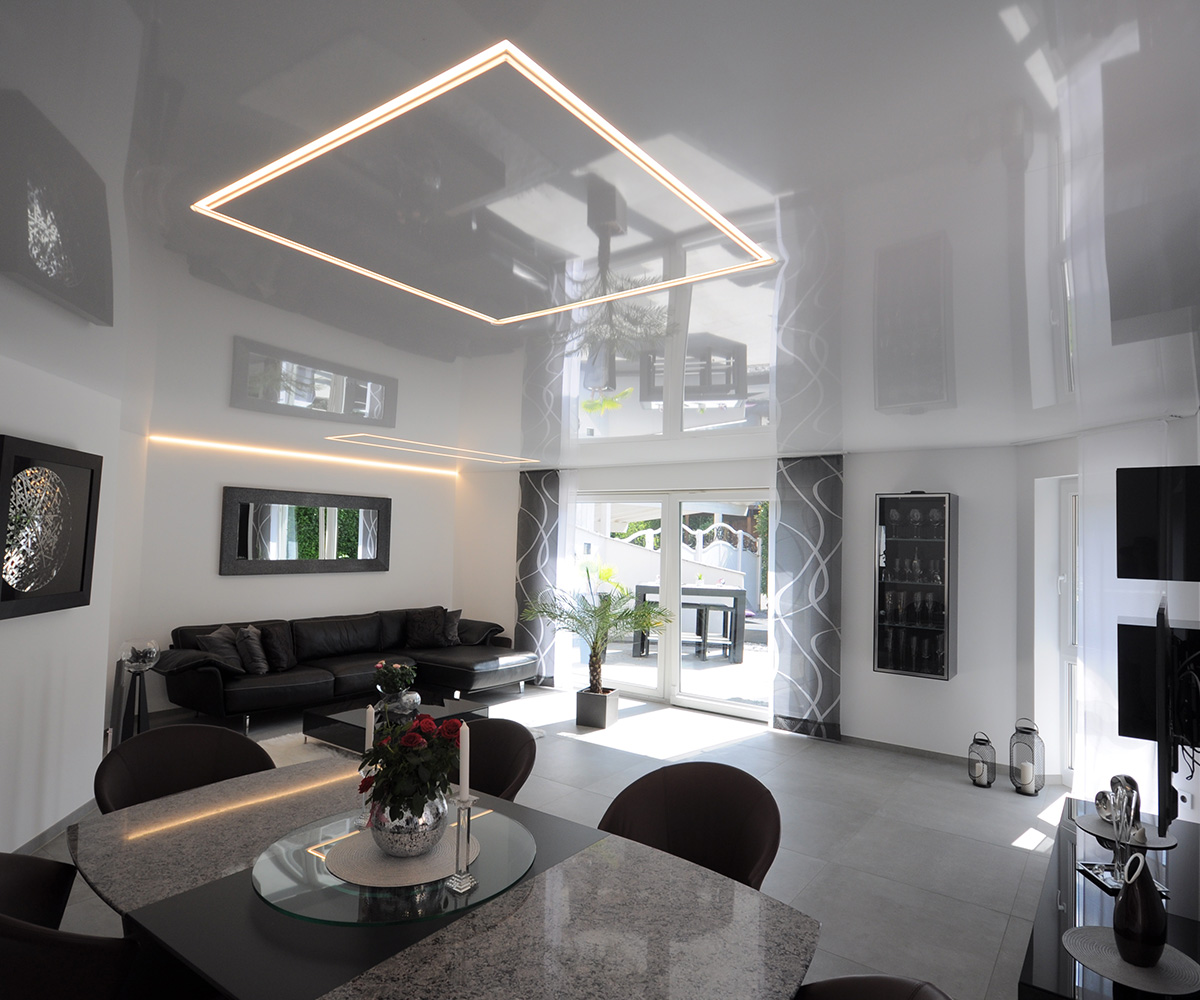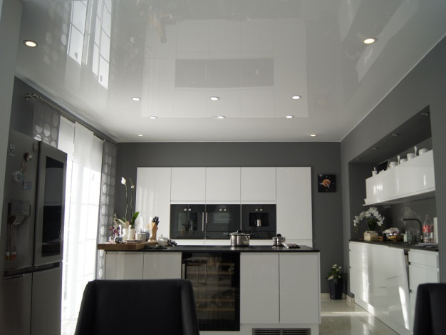 Глянцевый натяжной потолок имеет идеально ровную, гладкую и лакированную поверхность, обладает удивительной способностью отражать солнечные лучи, искусственный свет и предметы интерьера.